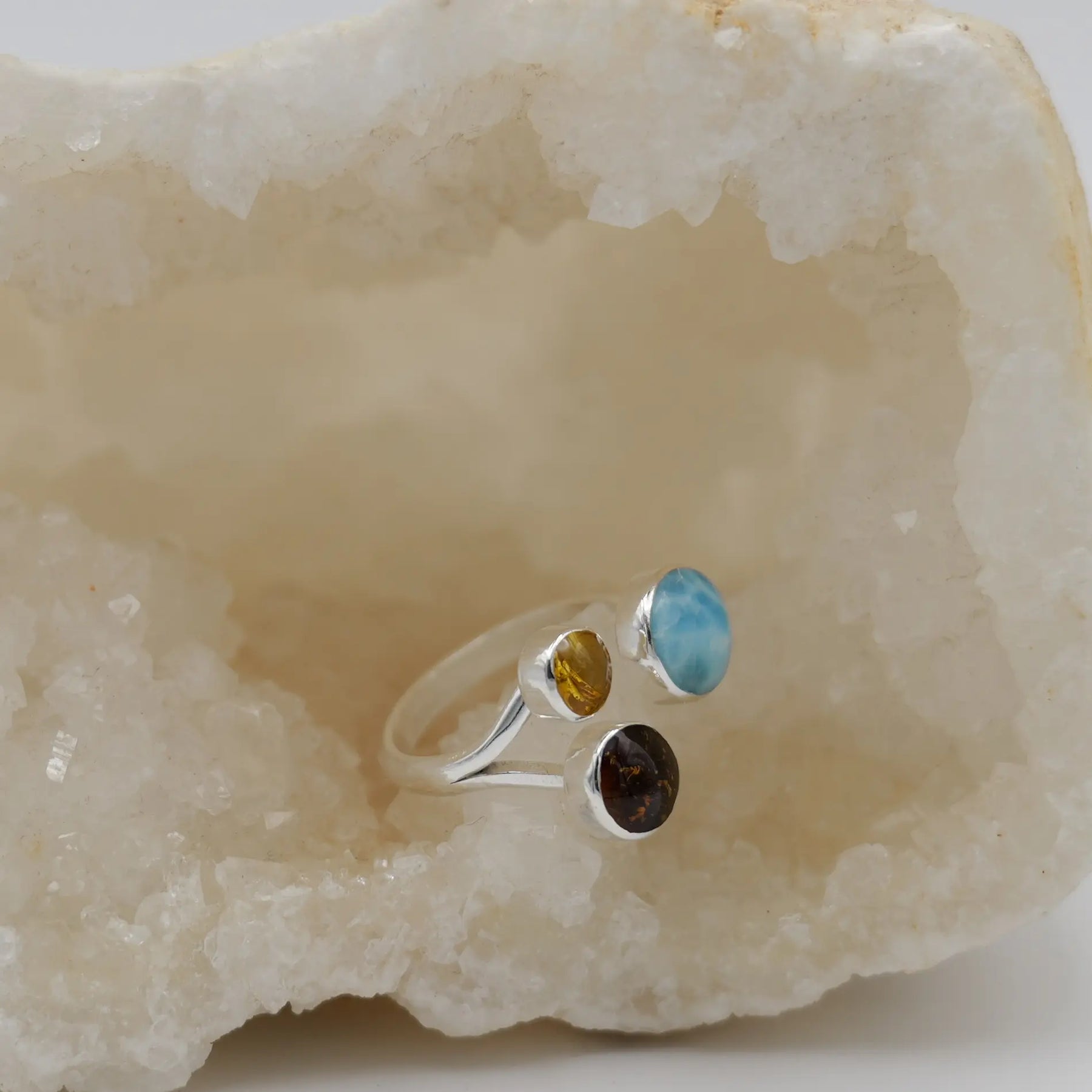 Bague QUISQUEYA ajustable en argent 925 avec 1 Pierre de Larimar + 2 Pierres d'Ambre.