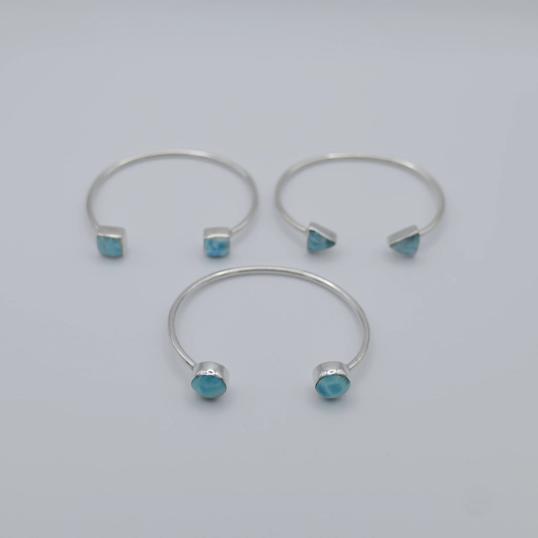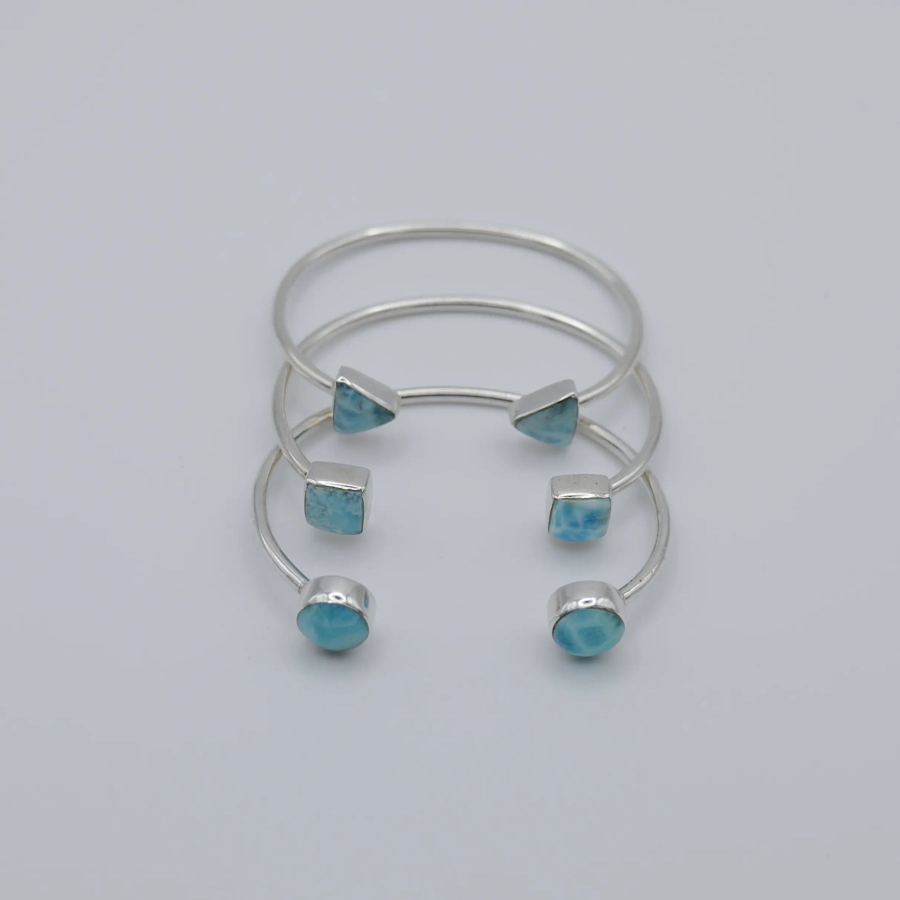 Trois joncs en Larimar en argent 925. Chaque jonc à sur chaque extrémité une pierre de Larimar de forme ronde, carré ou triangle.